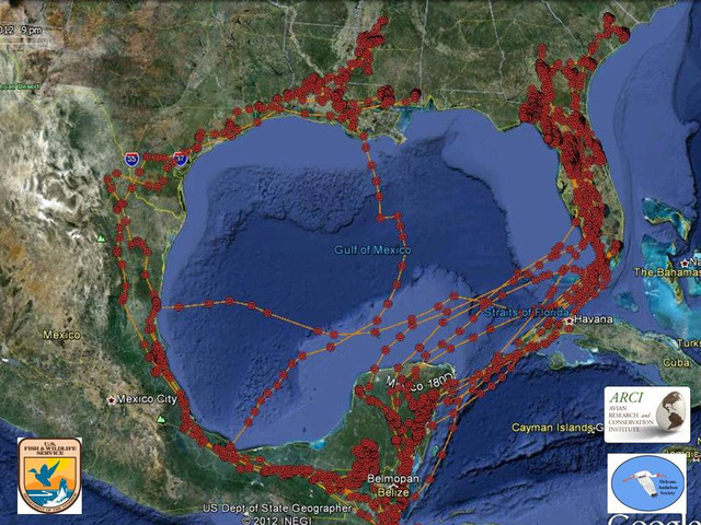 Last month, when we wrote about the start of this year’s southbound Swallow-tailed Kite migration (Swallow Tailed Kites Tallied at Roosts and Tracked by Satellite), several of our satellite-tracked birds had yet to make the risky 700 km over-water flight from the U.S. to Mexico’s Yucatan Peninsula. We are happy to report that all 13 tagged kites safely reached land by August 25th, just before tropical storm Isaac swept across the Florida Keys, and are continuing their 8,000 km journey to South America. Watch for an update soon on where they end up spending the northern winter.