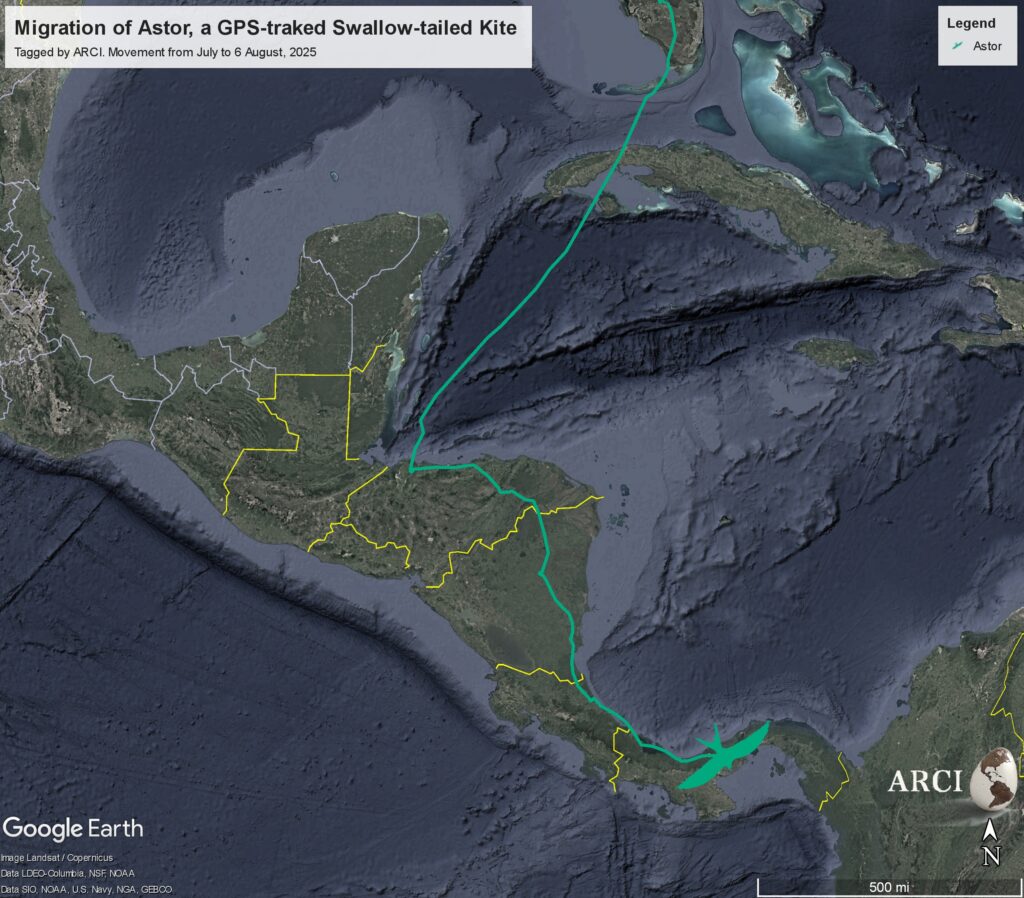 On 28 July, she continued south southwest flying all day and night, bypassing the typical migrating kite target of the Yucatán Peninsula, and finally made landfall in Honduras after flying more than 600 miles over open ocean! While most Swallow-tailed Kites typically arrive in Mexico’s Yucatán Peninsula and continue south overland through Central America, Astor took a risky shortcut to Honduras but was aided by good tailwinds.