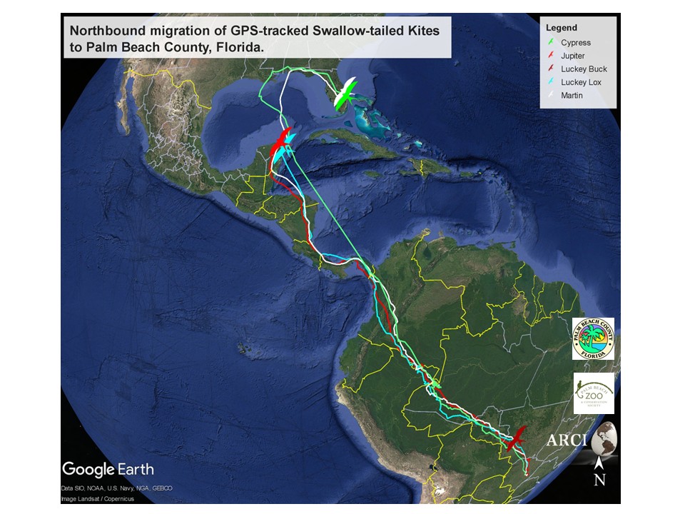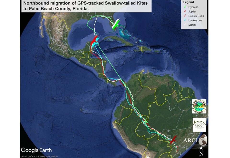 The GPS-tracked Swallow-tailed Kites that are part of this collaboration are migrating back to Palm Beach County, Florida. Two of them, Cypress and Martin, have returned to their nesting territories after a 5,000-mile migration from Brazil.